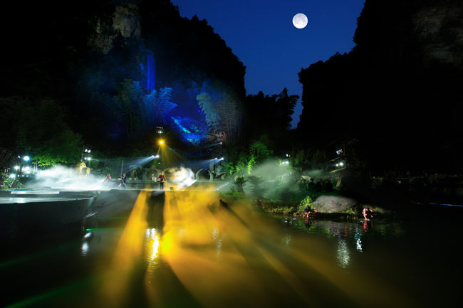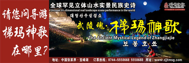 The Ancient Mystical Legend of Zhangjiajie 《武陵魂•梯瑪神歌》是一場記述土家族起源、演變、戰(zhàn)爭、生產(chǎn)生活等內(nèi)容的大型立體山水實景演出,揉合了音樂、舞蹈、文學(xué)等多種藝術(shù)形式,如幻如夢的舞美燈光,搖曳生姿的原生態(tài)歌舞……濃縮了土家族數(shù)千年的發(fā)展歷史,400多名演員以自然淳樸的表演充分的展示了土家的民族文化特征,給游客帶來了耳目一新的感受。一場視聽的饕餮盛宴,一曲驚天地、泣鬼神的曠世古歌,給人山水文化光影視聽的享受!境銎罚簭埣医缣莠斏窀栉幕瘋鞑ビ邢薰尽