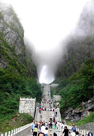 選擇乘索道游覽天門山是最佳視角。索道吊廂一出站房,馬上就騰空飛了起來(lái),從城市的一棟棟樓頂掠過(guò),猶如在城市上空滑翔。翻過(guò)一道山梁之后,城市被遠(yuǎn)遠(yuǎn)拋在了視線以外,大片翠綠的稻田映入眼簾,透過(guò)打開的通風(fēng)窗口,一陣陣青草水田特有的清香沁入心脾。或高或低的農(nóng)舍不時(shí)從我們身下滑過(guò),牛羊們?nèi)齼蓛捎崎e的在田間浮動(dòng)著,靜謐、安詳。再翻過(guò)一座山峰,我們便立即被滿山的青翠所包圍,萬(wàn)仞絕壁也已投懷送抱。索道支架矗立于絕壁天險(xiǎn)中,或挺立或傾倒或探頭或擁抱,我們繼續(xù)在艱險(xiǎn)中游歷,時(shí)而隱沒于云堆,時(shí)而出世于蒼穹。這時(shí)你除了那滿懷的驚險(xiǎn)刺激外有的便只有望索而興嘆了。我拍了很多片子,但是總覺得還是沒有足以記錄下來(lái)這座空中盆景的壯麗。