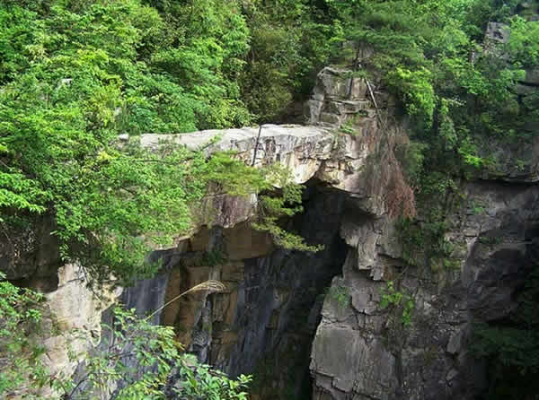 仙人橋又稱天下第一橋,坐落在猴子坡上、天子峰下的王爺洞對面。橋?qū)僮匀恍纬,長26米,寬1.5米,厚一米多,高約六七十 米,飛架在兩岸懸崖絕壁之上,鬼斧神工,惟妙惟肖,古人云:“天地可掬,此真天造也”。仙人橋為紅砂巖結(jié)構(gòu),兩端生有高大的黃山松和杜鵑樹,濃蔭掩映,極其美麗。橋的東頭還有自然形成的石級,人可順石級而下,走上天橋,下視萬丈深淵,令人頭暈?zāi)垦,非健壯者不敢逾越,旅游者無不贊嘆,說它是“天下絕景”。