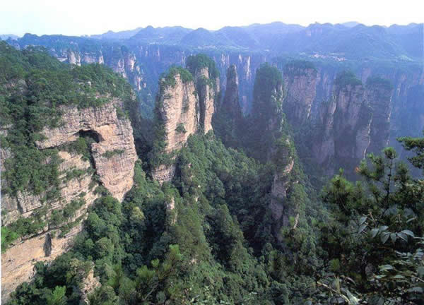 這就是大觀臺(tái)。極日遠(yuǎn)眺,千百座奇峰盡收眼底。一位詩人說,武陵源的砂巖石峰是一步一觀景,千步千造型,一山有四季,十步不同大。專家測算出武陵源石峰有3103座。一如一位高超的雕塑大師,模擬宇宙萬物,無不形態(tài)逼真,維妙維肖,栩栩如生,呼之欲動(dòng)。有的如海螺出水,有的如金龜銜日,有的如蓮花盛開,有的如天橋橫空,有的如長槍刺大,有的如寶塔聳立,有的如老人采藥,有的如玉女梳妝,有的如將軍出征,有的如戰(zhàn)馬長嘯,有的如情人幽會(huì),有的如夫妻相擁,有的如仙女散花,有的如村姑守望……有的孤峰獨(dú)秀,有的直插云霄,有的婷婷玉立,有的威武勇猛,有的小巧玲瓏,有的大氣磅礴。進(jìn)入武陵源,但見一片峰的森林,峰的世界,峰的海洋。挺拔、奇秀、集中、原始、粗獷、古野。這就是武陵源。 一位藝術(shù)大師說:武陵源的山峰,改寫了山的概念。大攝影家陳勃說 :“三山五岳堪比美,華夏風(fēng)光第一流!蓖趵^杰先生說:“武陵源上二日游,勝讀千篇李杜詩。”許世杰先生說:“秀幽險(xiǎn)峻稱奇絕,五岳黃山拜·卜風(fēng)!崩畛扇鹣壬鸀榇舜蟊Р黄剑骸吧裰輨倬罢l為最?須請(qǐng)霞公重評(píng)勘。”可惜徐霞客無緣到大觀臺(tái)來,也不可能為武陵源作甚評(píng)價(jià)了。