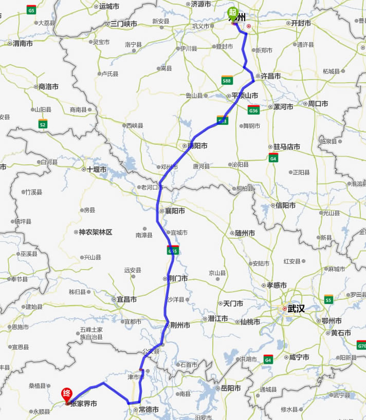 滎陽(yáng)去張家界自駕車自助游線路圖全程高速):
