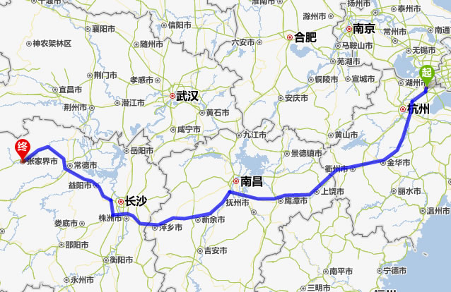 左右,沿途經過嘉興——杭州——桐廬縣——建德市——衢州市——上饒市——鷹潭市——新余市——宜春市——萍鄉(xiāng)市——株洲市——湘潭市——寧鄉(xiāng)縣——益陽市——常德市——慈利縣——張家界。