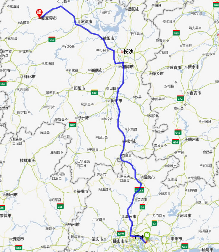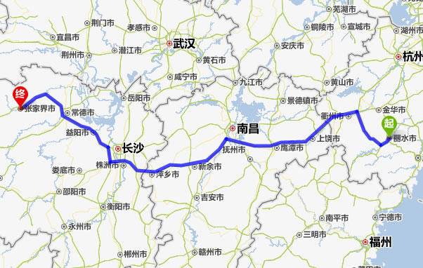 左右,沿途經過麗水——衢州市——上饒市——鷹潭市——新余市——宜春市——萍鄉(xiāng)市——株洲市——湘潭市——寧鄉(xiāng)縣——益陽市——常德市——慈利縣——張家界。