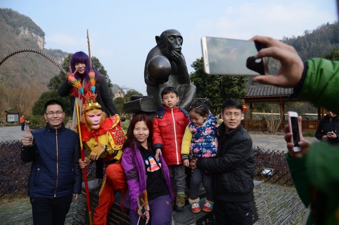 手持金箍棒,頭戴紫金冠。2月2日,農(nóng)歷臘月二十四,中國傳統(tǒng)小年節(jié)氣。當(dāng)天下午,旅游勝地張家界武陵源黃龍洞景區(qū),一名“美猴王”打扮的特殊游客現(xiàn)身“后天”雕塑、龍宮大廳、花果山等景點(diǎn),其惟妙惟肖的“孫悟空”動作表演,不時(shí)引來其他游客的驚呼:大圣歸來!